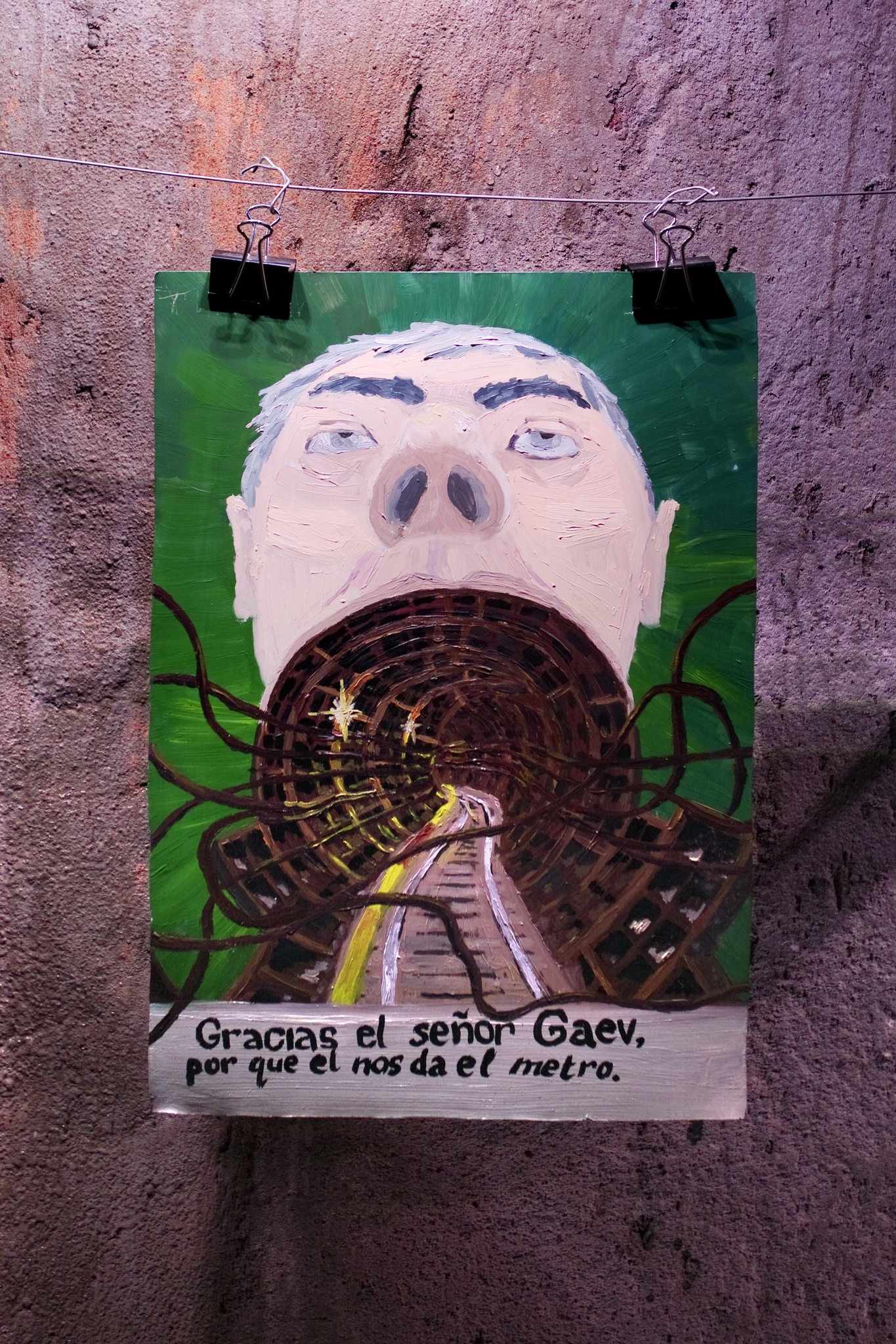 Those spaces included a patch of wasteland that was once a cinema, the arches leading to Tesco’s car park, some peculiar flower beds seemingly modelled on an altar for human sacrifice, unmonumented plinths in a former graveyard, cryptic marks on a wall, a Methodist chapel suspended in aspic-dust halfway between ruin and restoration, and the empty stage of the Regent cinema. We also walked very slowly around the Richard Long exhibition in the Potteries Museum, trying to get in touch with the spirits of the architects behind the 1960s building, and we clustered into a pedestrian horse outside the horseshoe-shaped doorway of a legal chambers. Along the way we cast health and safety to the wind, climbing over hillocks and holes and broken floors and risking arrest (or drawing attention) by quietly looking for things to steal, committing tiny acts of arson or disguising ourselves in black masks (our own personal patches of darkness)…